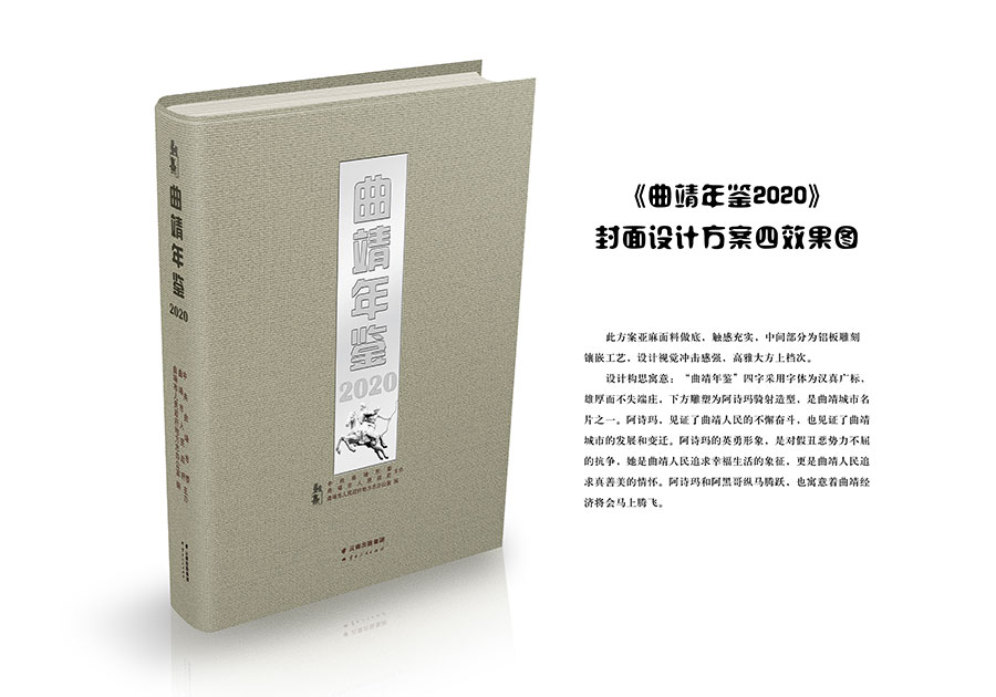 設(shè)計構(gòu)思寓意:“曲靖年鑒”四字采用字體為漢真廣標,雄厚而不失端莊,下方雕塑為阿詩瑪騎射造型,是曲靖城市名片之一。阿詩瑪,見證了曲靖人民的不懈奮斗,也見證了曲靖城市的發(fā)展和變遷。阿詩瑪?shù)挠⒂滦蜗?,是對假丑惡勢力不屈的抗爭,她是曲靖人民追求幸福生活的象征,更是曲靖人民追求真善美的情懷。阿詩瑪和阿黑哥縱馬騰躍,也寓意著曲靖經(jīng)濟將會馬上騰飛。